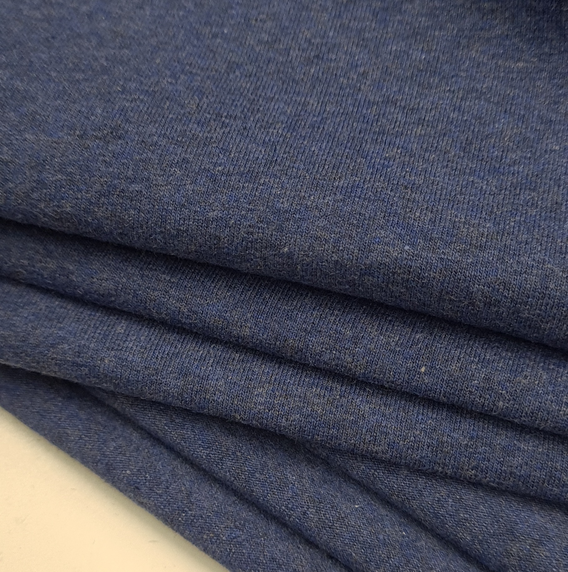 Plonas, bet tankesnis medvilnės trikotažas/džersis. Medžiaga minkšta ir elastinga, neskysta. Maišyti pilkšvai mėlyno ir navy mėlyno spalviniai tonai, kurie sukuria džinso įspūdį. Tiks palaidinėms, suknelėms, kepurėms, tamprėms, movoms.