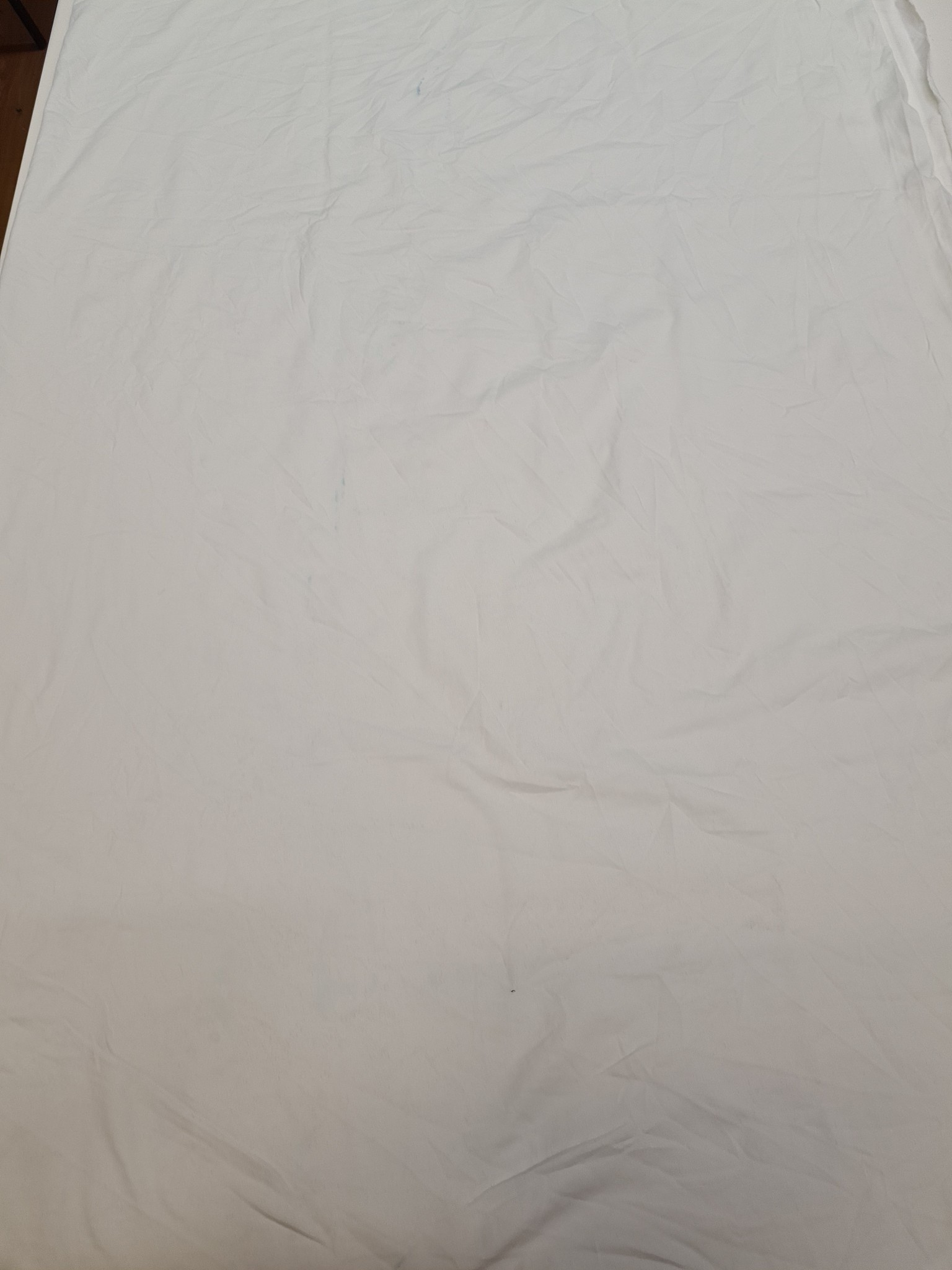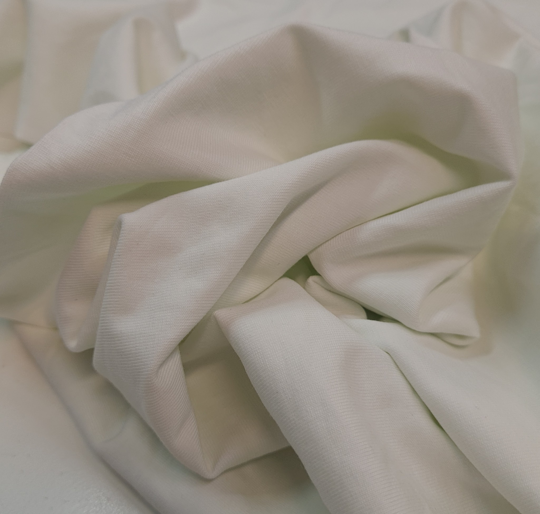 Plonas medvilnės trikotažas/džersis. Medžiaga minkšta ir elastinga. Baltumas yra toks kremiškas ir lyg turi kažkokį mėtinį šešėlį. Tiesiog bandau apibūdinti, kad nesitikėti švarios baltos spalvos 🙂 Tiks palaidinėms, suknelėms, kepurėms, tamprėms, bodžiams.