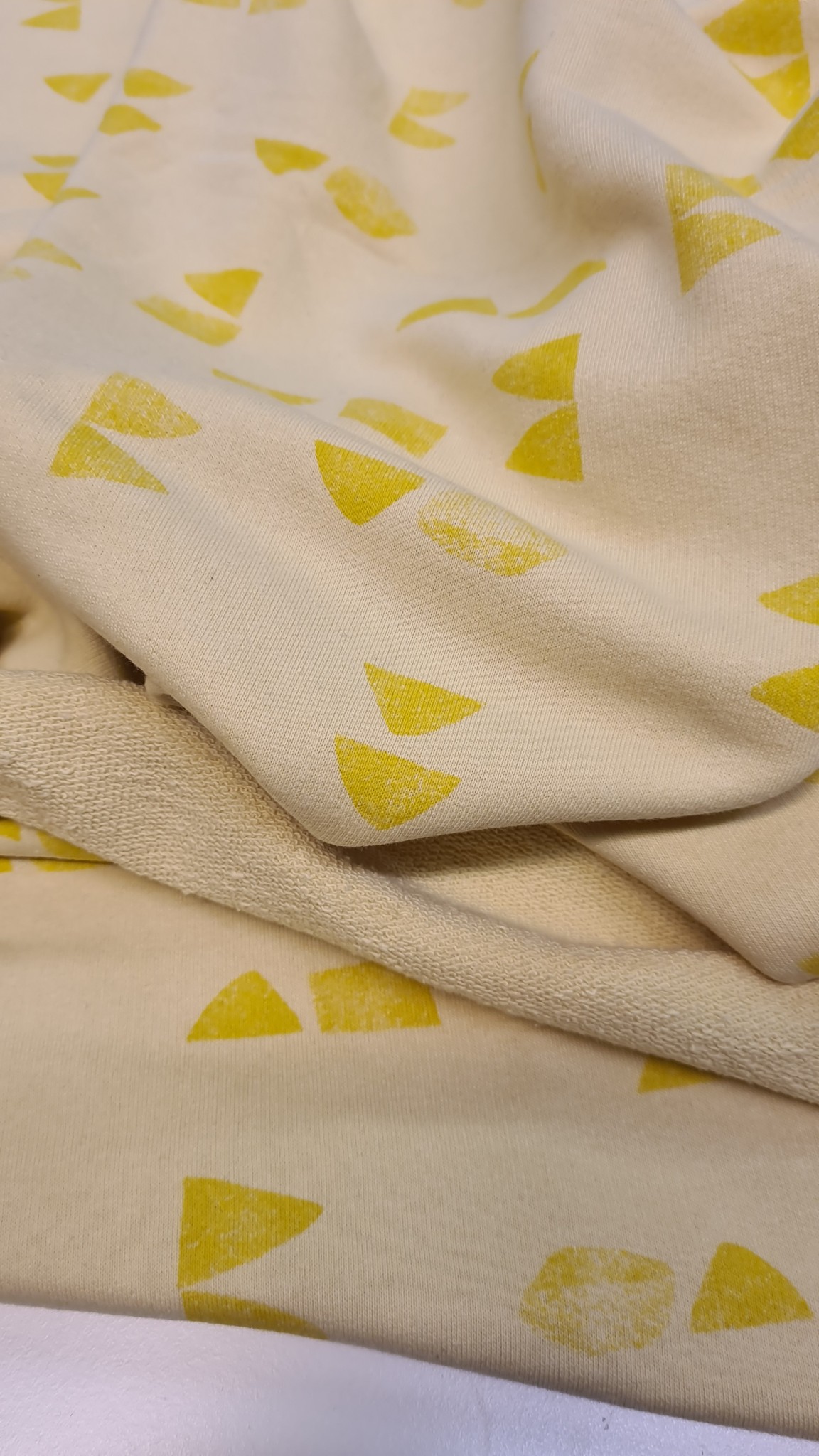 Vidutinio storumo trisiūlis kilpinis trikotažas. Medžiaga tiks lengviems džemperiams, suknelėms, kelnėms.