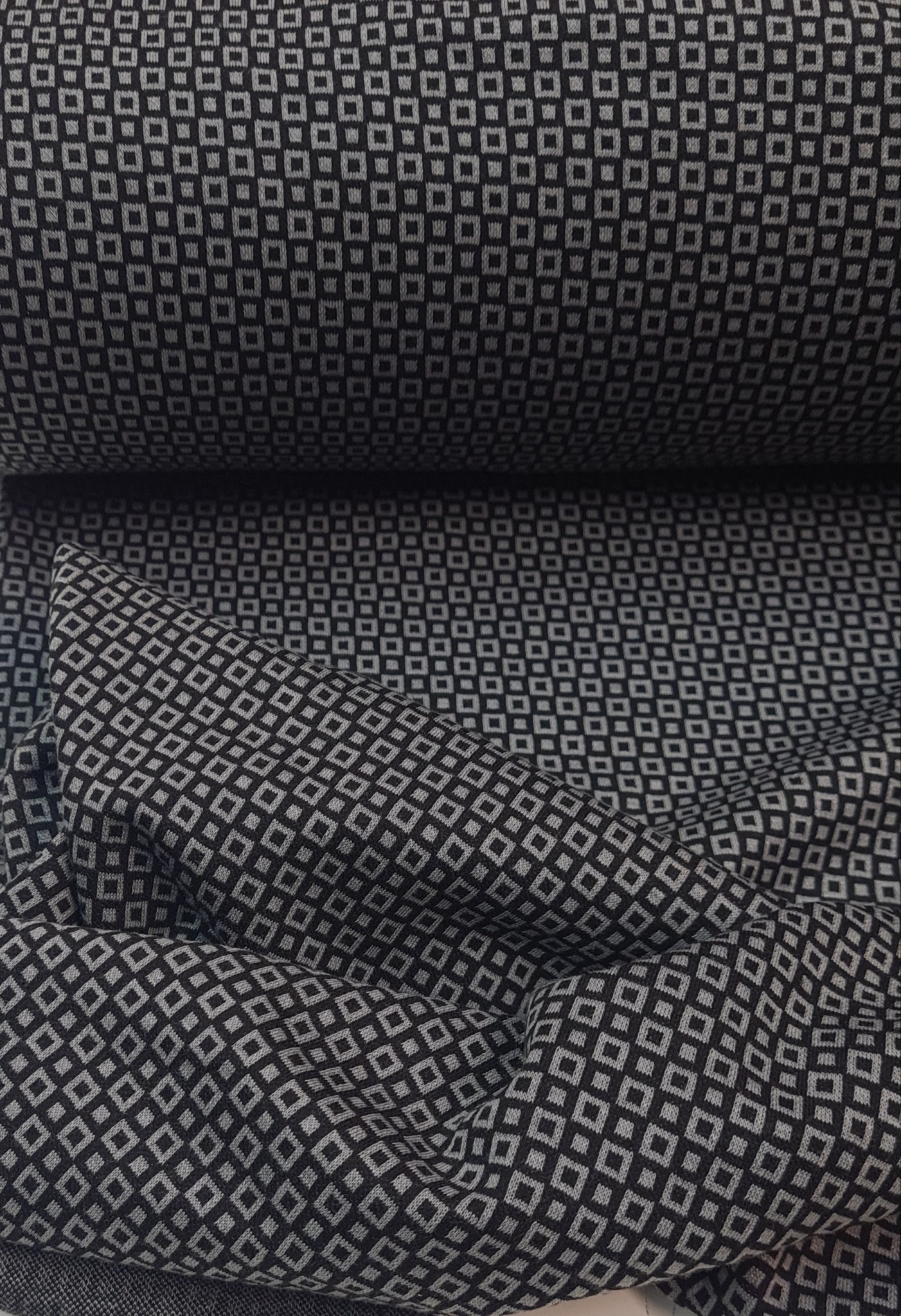Žakardinio dvigubo mezgimo, švelnus, mielas prie kūno trikotažas. Langelių dydis apie 7 mm. Vidutinio storumo. Labai tiks ofisinio stiliaus drabužiams. Puikiai tiks suknelėms, sijonams, sarafanams, megztiniams, kelnėms.