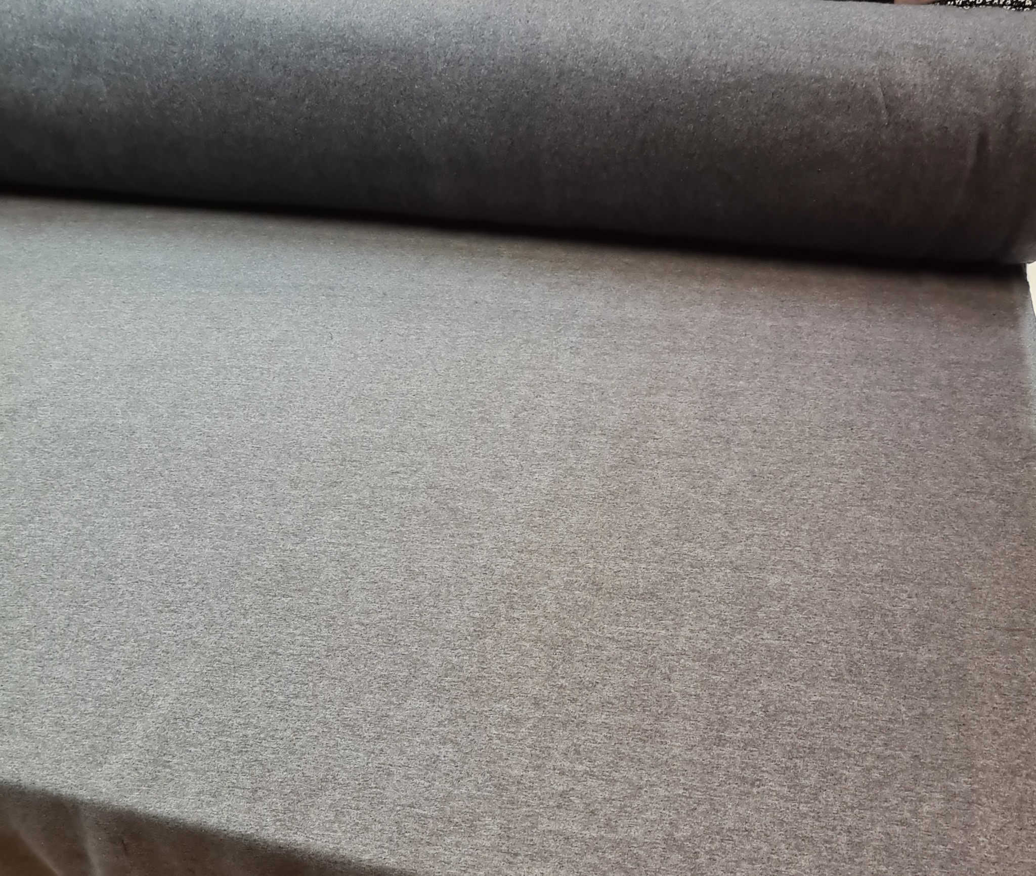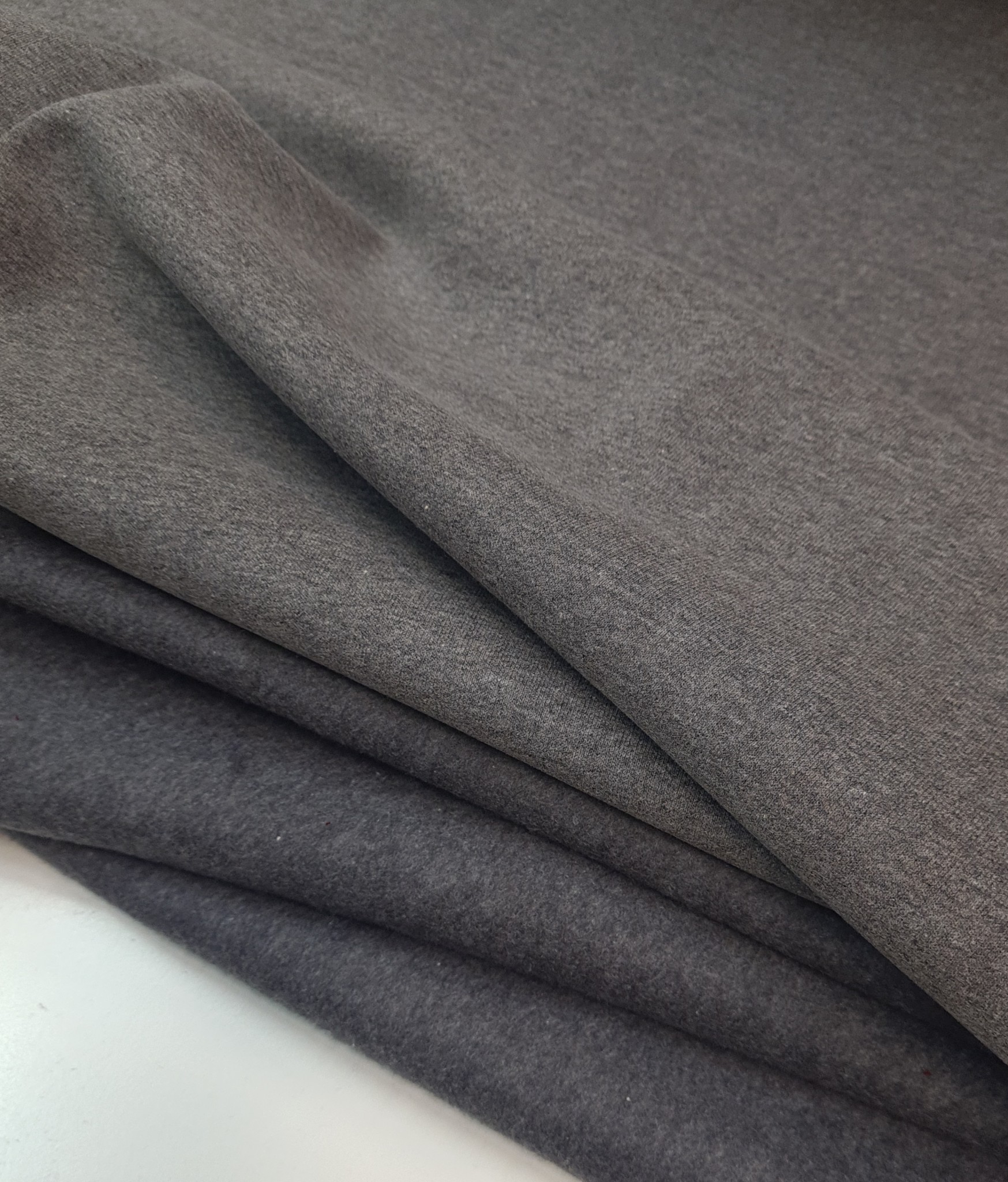 Vidutinio storumo trisiūlis kilpinis trikotažas su pūku. Maišyti keli pilki tonai. Medžiaga be galo minkšta. Tiks džemperiams, suknelėms, kelnėms, sportiniams kostiumams.