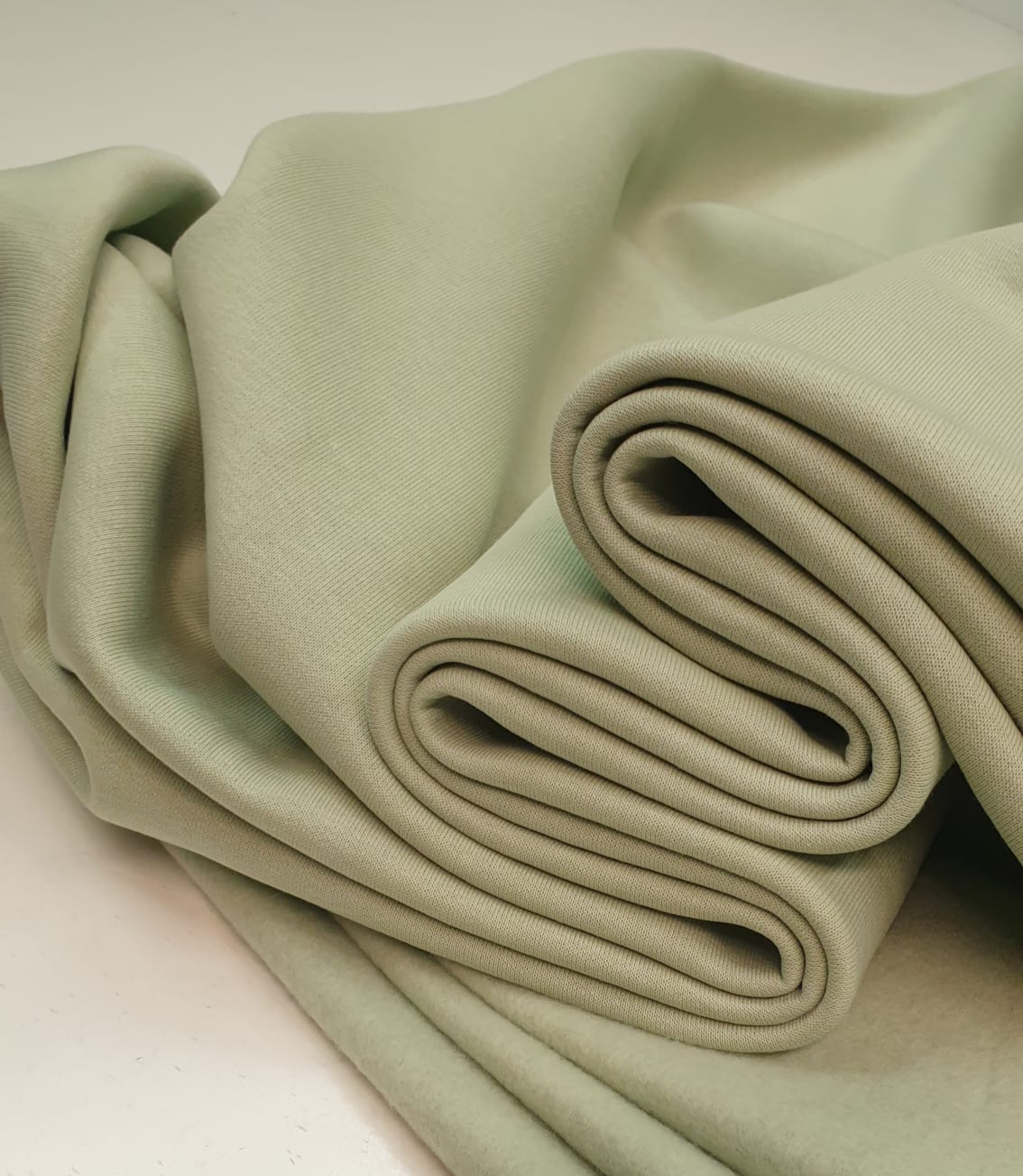 Vidutinio storumo trisiūlis kilpinis trikotažas su pūkeliu. Medžiaga yra labai minkšta ir miela prie kūno. DERA SU RIB, LILY GREEN