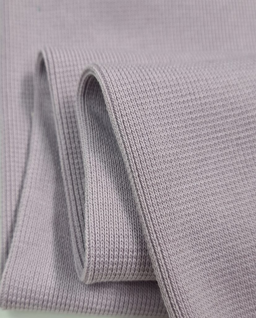 Vidutinio storumo, bet tankesnis medvilnės su elastanu rib trikotažas. Lygaus mezgimo.