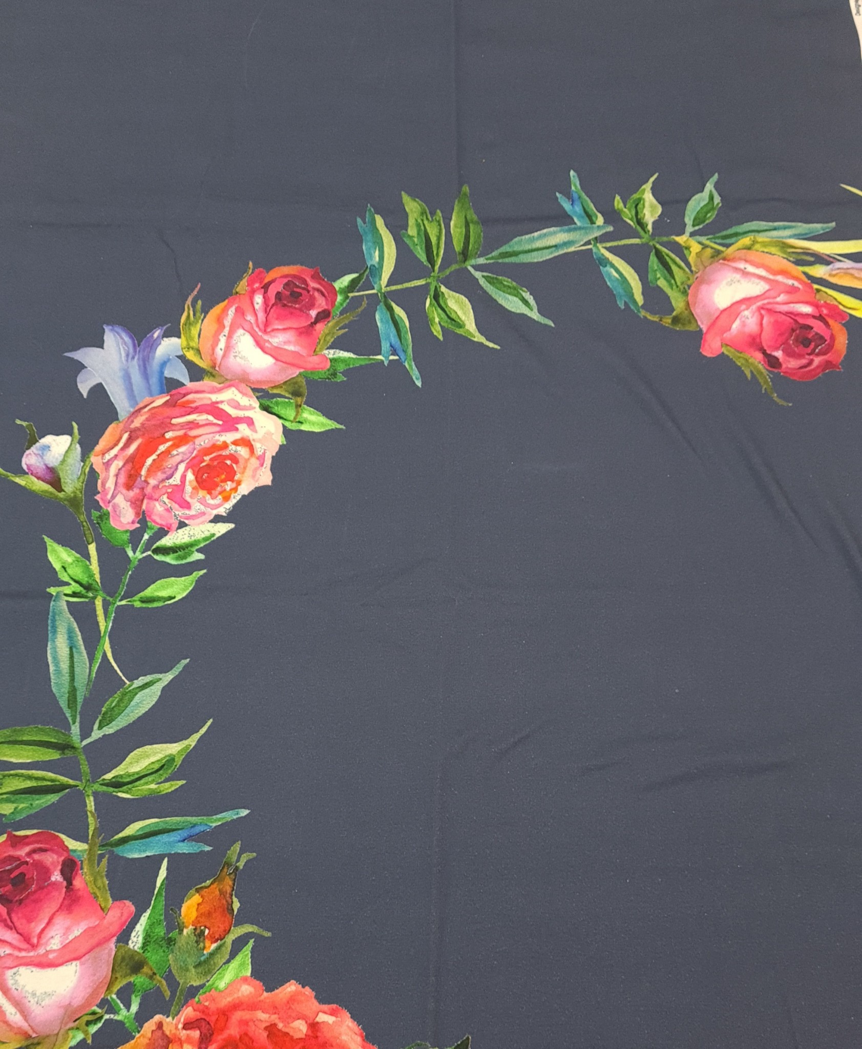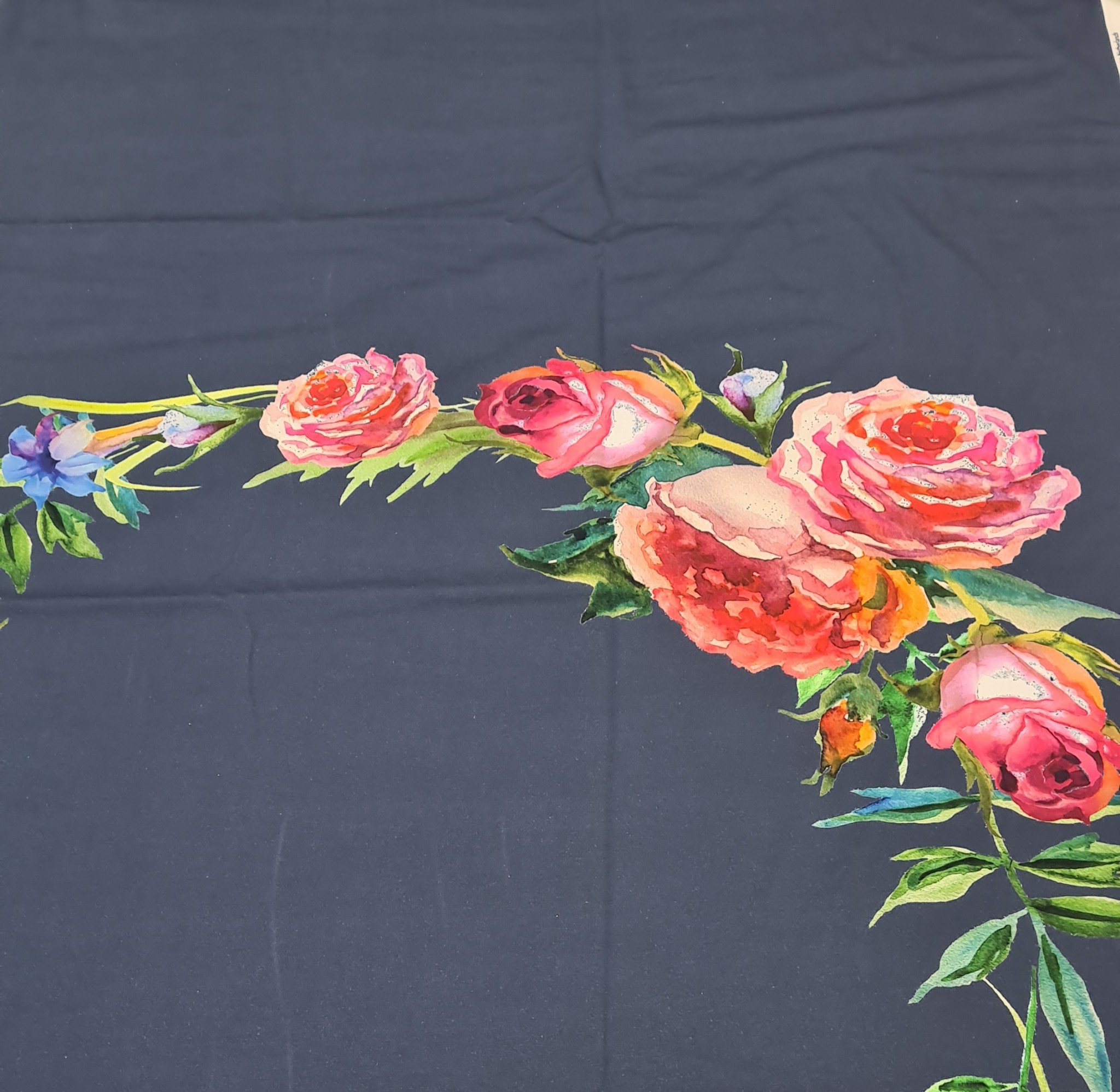 Plonas medvilnės trikotažas. Neskystas. Nepersimato. Pats raštas taip išdėliotas, kad realiai tik fantazijos reikalas, kaip ir kur tas gėles išdėliot. Tiks tamprėms, palaidinėms, suknutėms, kepurėms, movoms.
