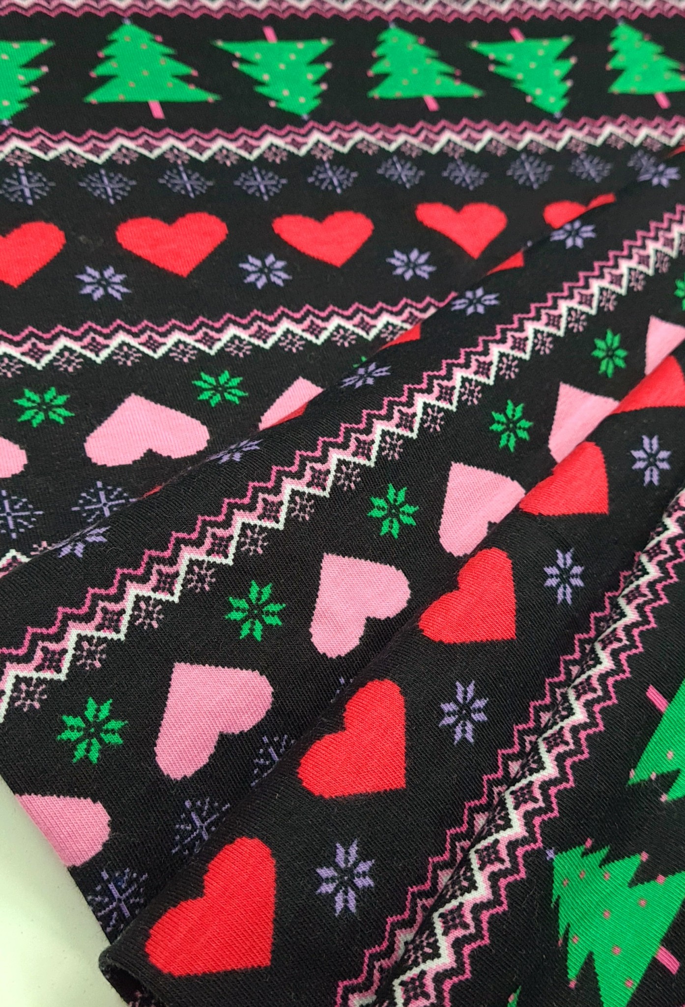 Plonas medvilnės trikotažas (džersis) su elastanu. Eglučių dydis – 4 cm, širdelių apie 2 cm. Tiks suknelėms, sijonams, palaidinėms, tamprėms, kepurėms, movoms, pižamoms.