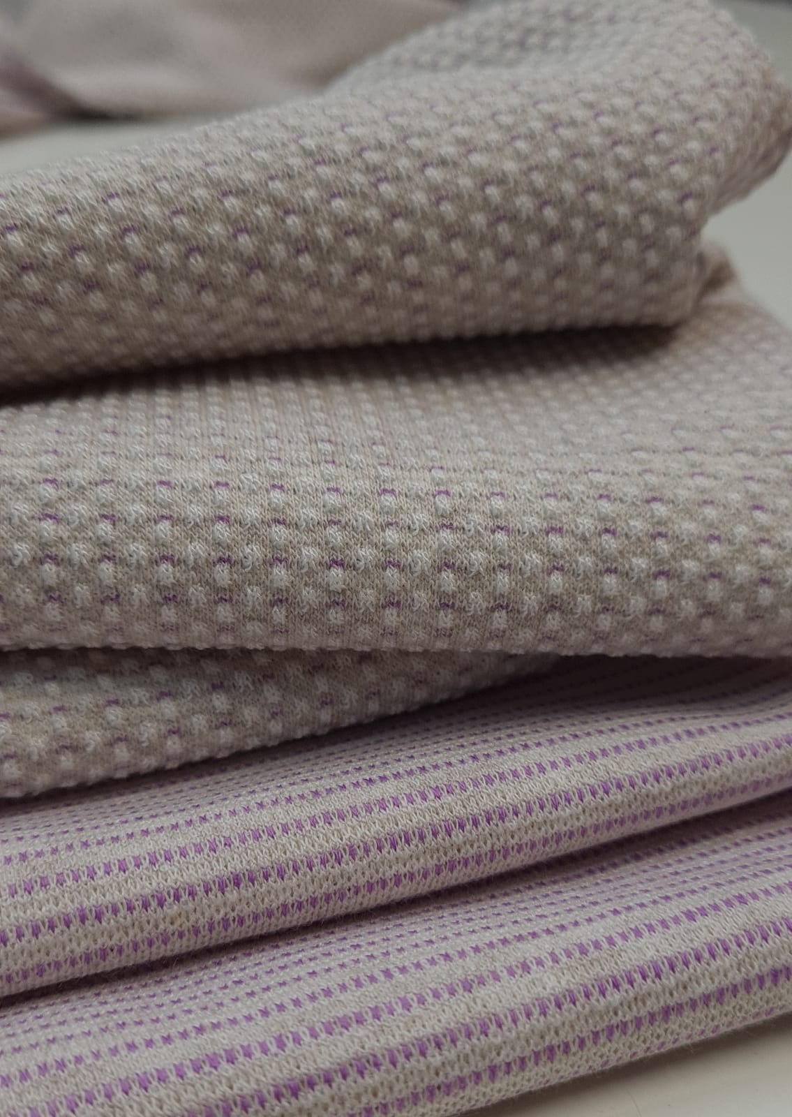 Dvigubo mezgimo, neskystas, elastingas trikotažas. Viena pusė – dryžuota, kita pusė su faktūriniai kalniukais/žirniukais. Medžiaga labai įdomi. Galima žaisti su abiem pusėmis. Tiks džemperiams, suknelėms, kelnių/megztinių kostiumams, kepurėms, movoms.